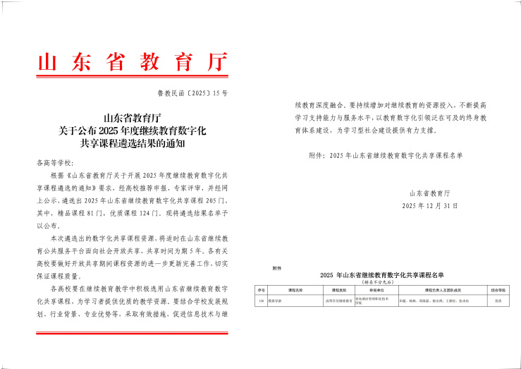 本网讯(继续教育学院)近日,山东省教育厅公布了2025年度山东省继续教育数字化共享课程和社区教育优秀课程资源遴选结果,我校7门课程入选。